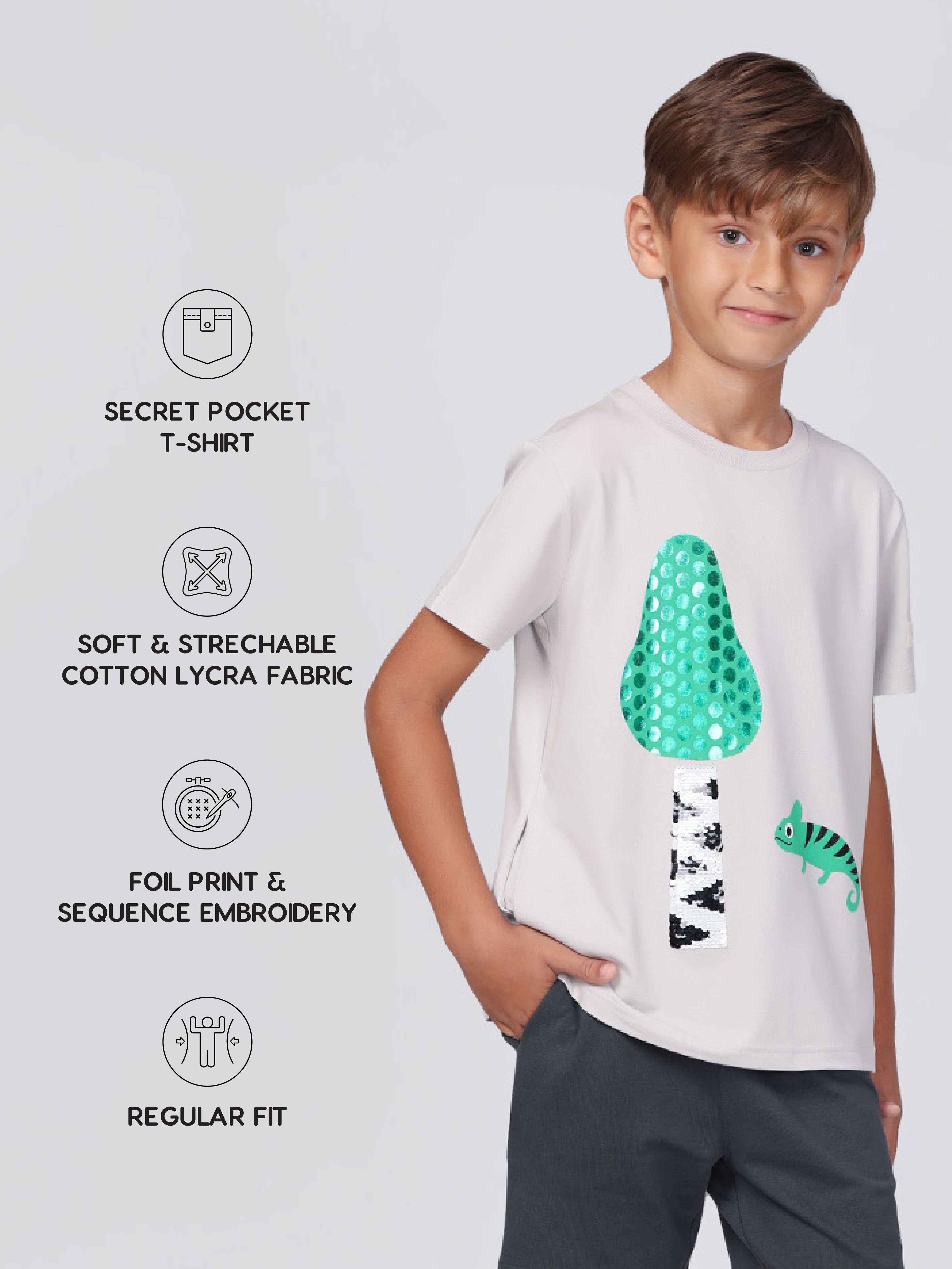 SKU: 037 - Pilolo Grey With Green Gecko Animal Printed Cotton Pocket T-Shirt For Boys