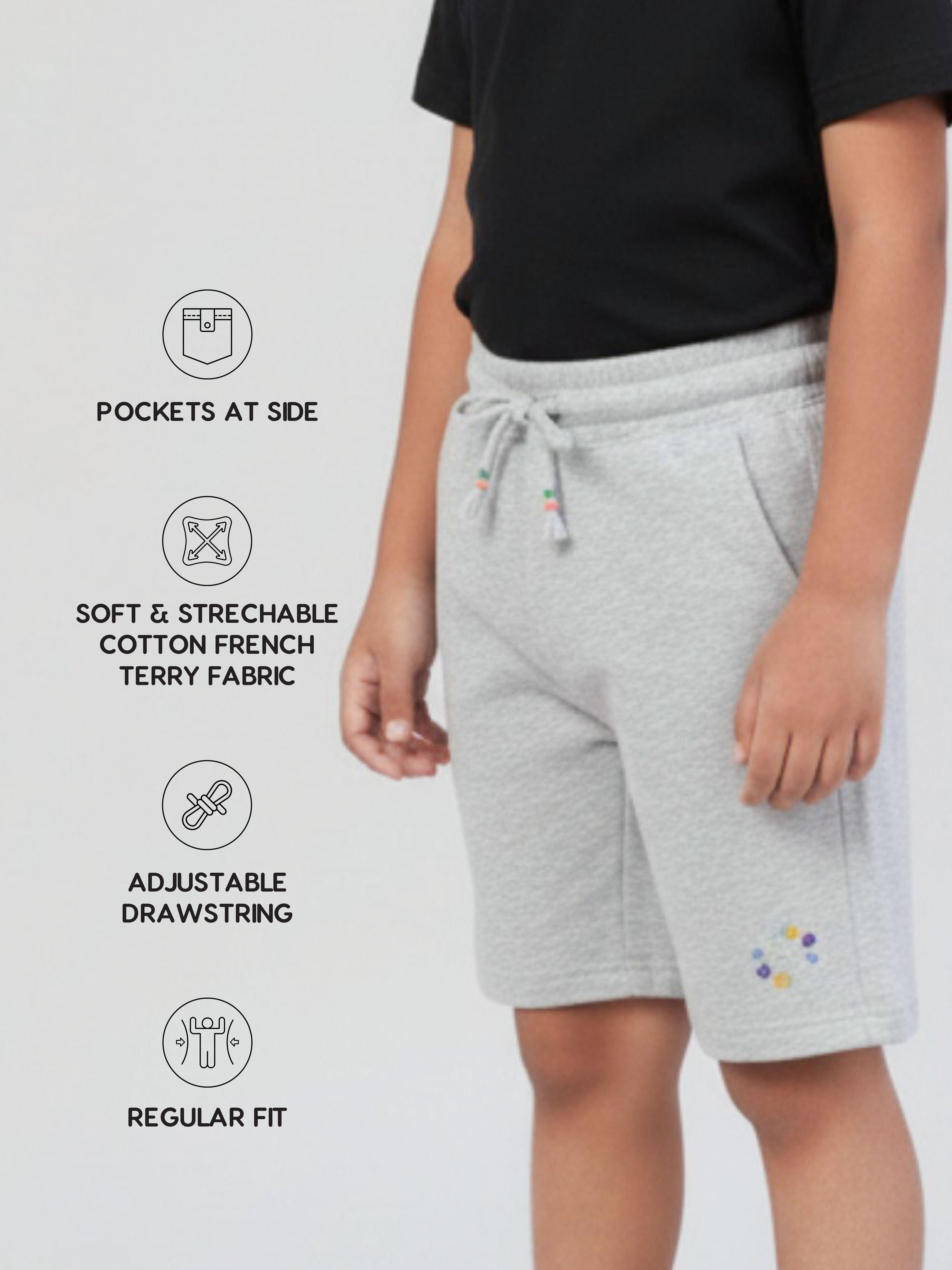 Everyday Melange Shorts are designed from soft breathable fabric that offers comfort and style. The fun, colorful design have aesthetic and practical uses as it features embroidery, pockets, an elastic waist, and drawstrings offering your child a firm fit. The shorts are ideal for everyday adventures, functionality, and a splash of fun. Run those on-the-spot races with friends or have play tag on the lawn, in these comfy shorts. Fit: Regular Fabric: 95% cotton, 5% elastane, French Terry Lycra Care Instruction: Tumble dry with cold water; keep it fresh, do not bleach. Waist: Mid-Rise Color: Melange Grey