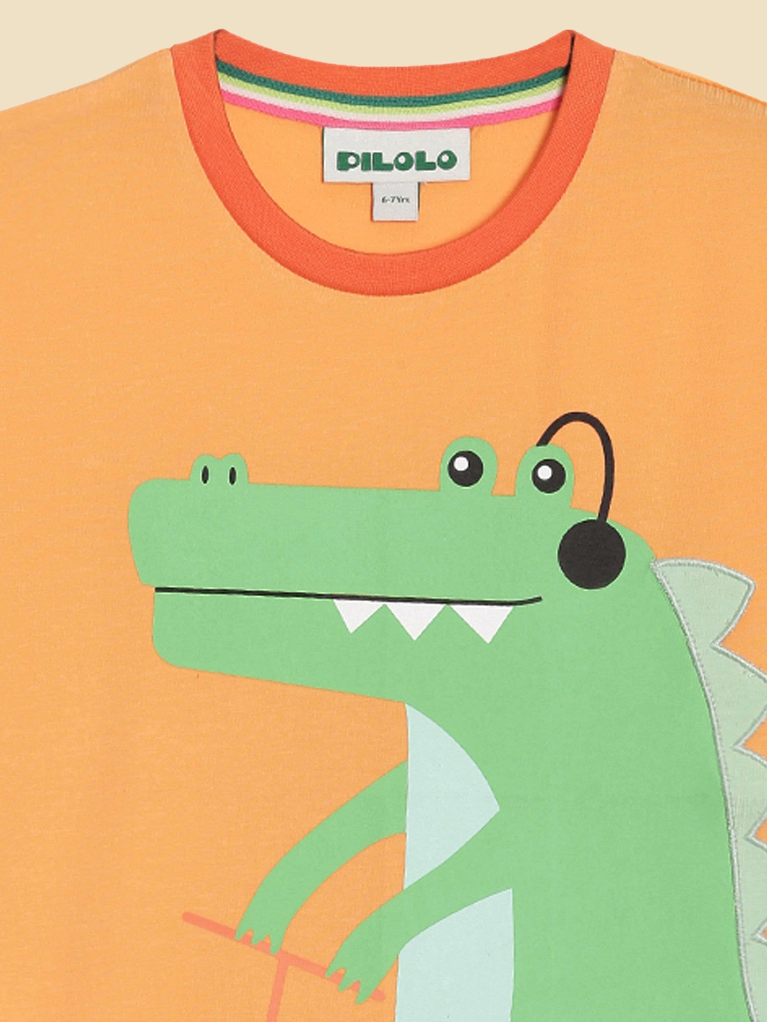 Crafted using lightweight, breathable fabric, the Alligator T-Shirt ensures all-day comfort. It features a fun, colorful design with eye-catching embroidery, an alligator with an applique tail and shiny foil-printed headphones. Every piece comes with a pocket that is adorable and practical - as little hands deserve a place to tuck their little adventures. Made to fit kids 2 to 10.