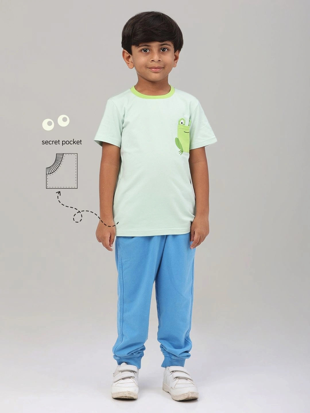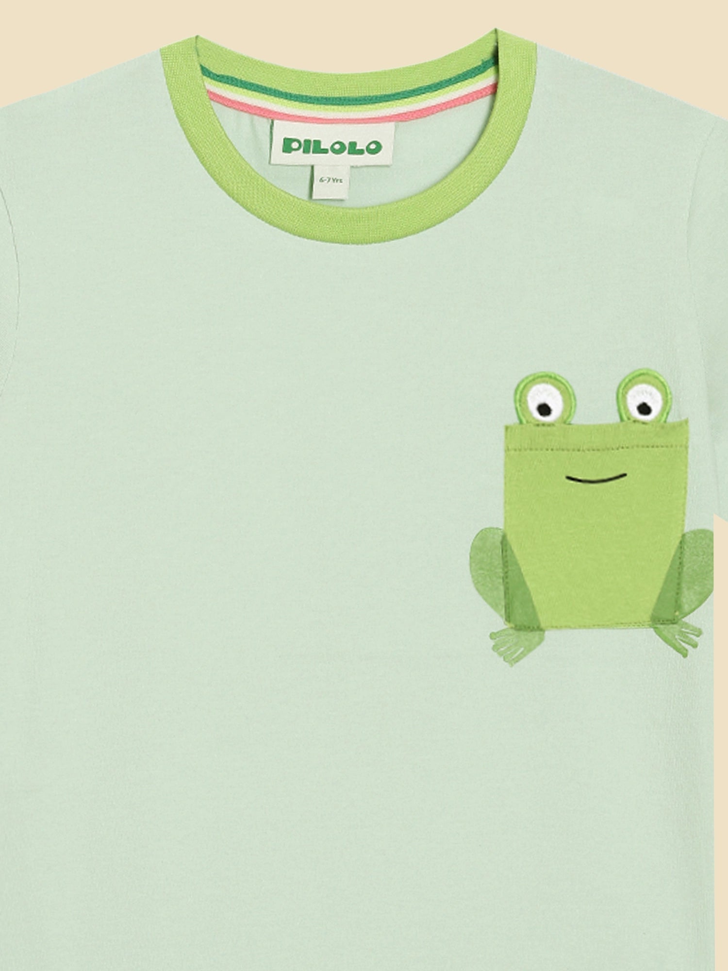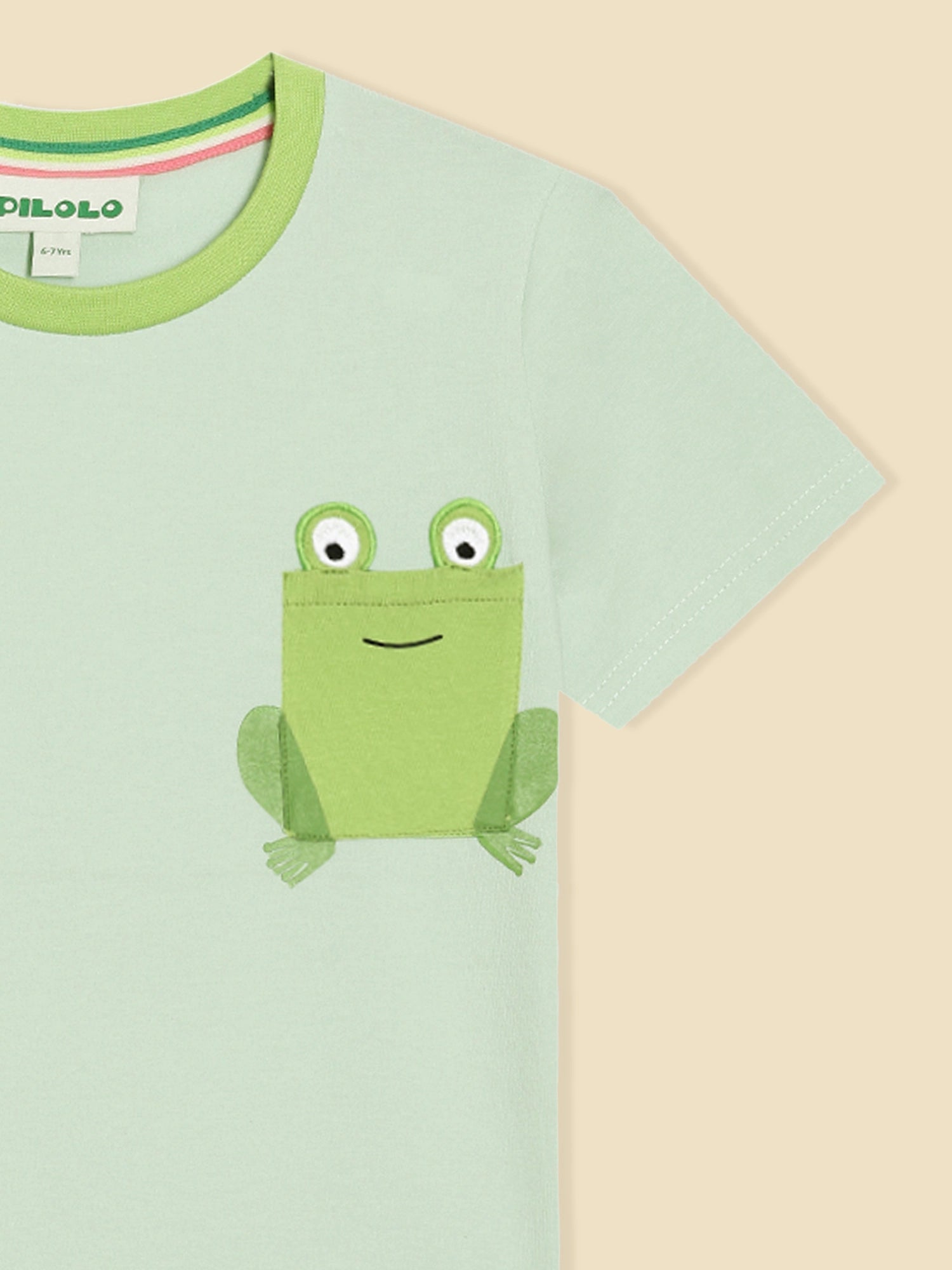 Brighten up your kid's wardrobe with the Friendly Frog Tee to keep them cheerful through the day. The featured tee from our collectible tee collection, comes with a contrasting neckband, a frog pocket and back print. Every piece has a pocket that is adorable and practical - as little hands deserve a place to tuck their little adventures. Made to fit kids 2 to 10.