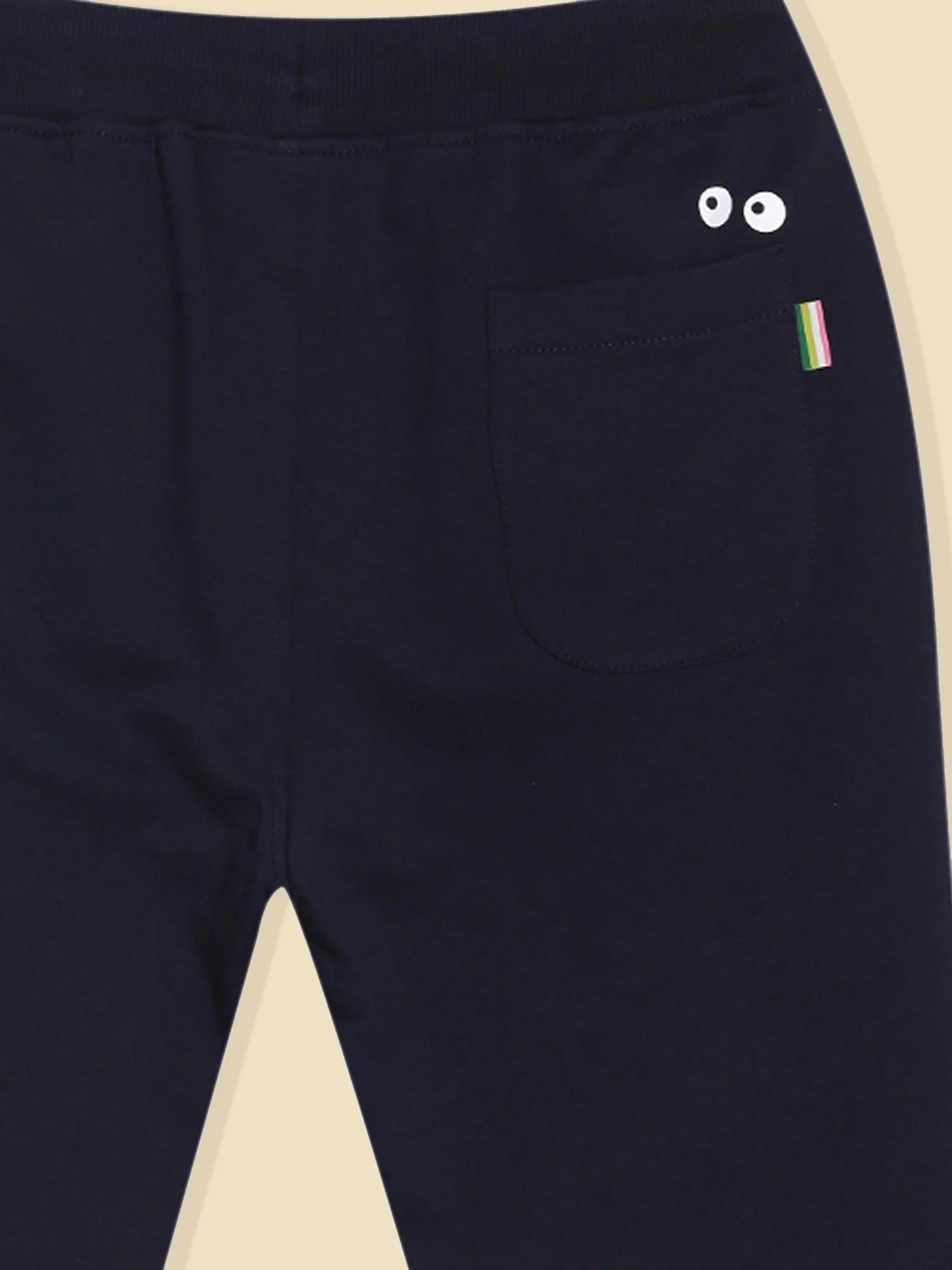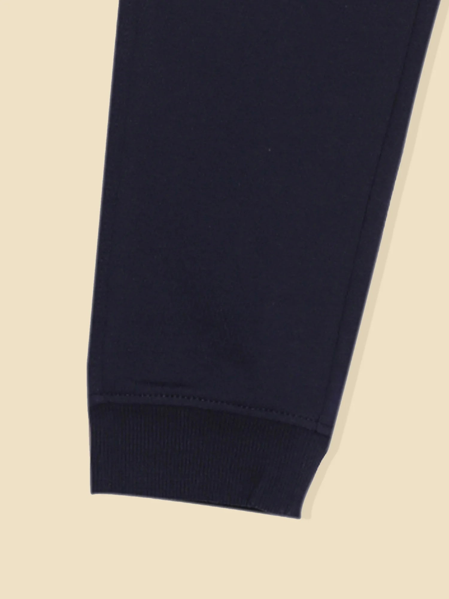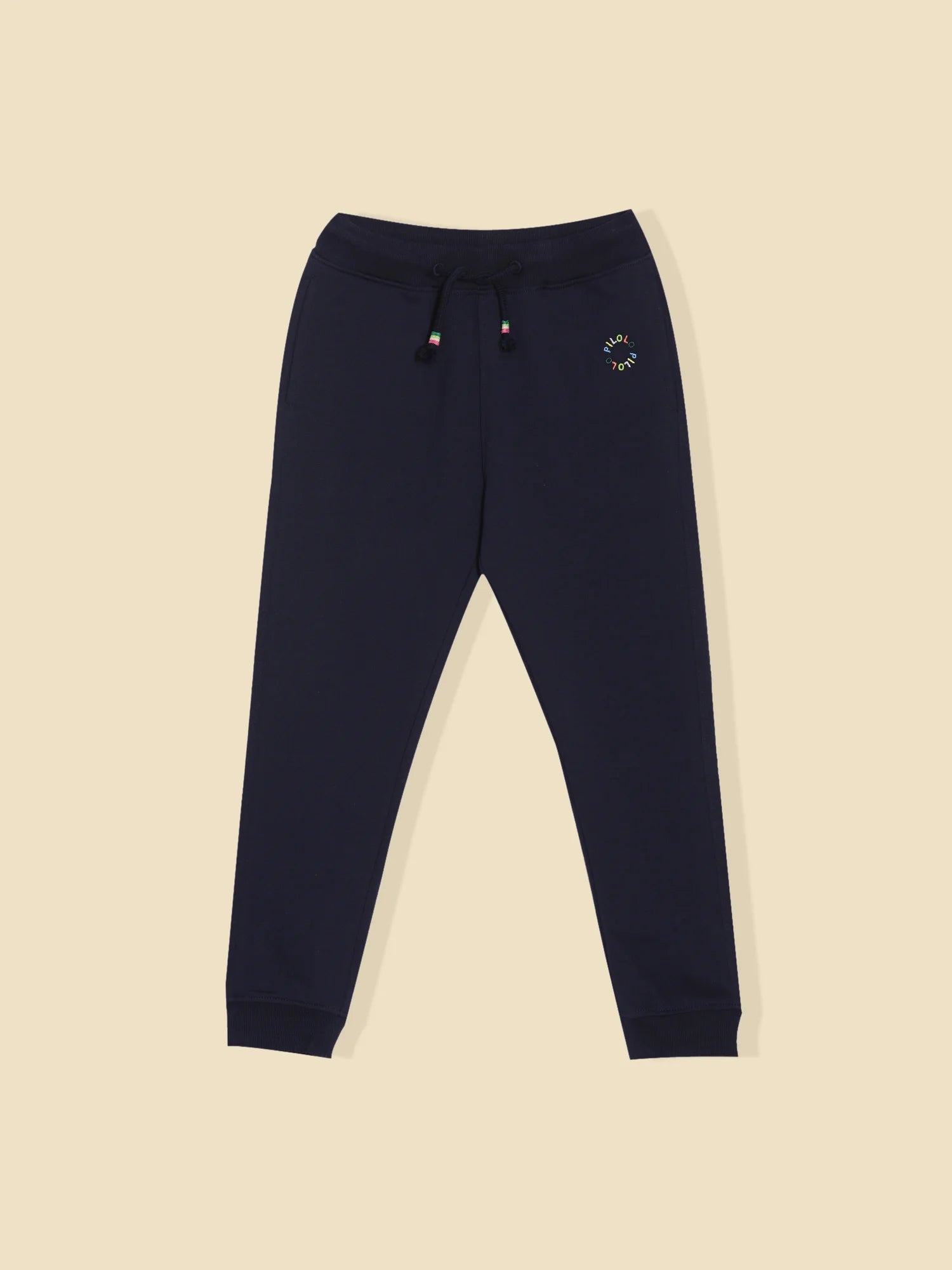 Run, jump and make memories without missing a beat in the Active Navy Joggers. The joggers have aesthetic and practical uses as it features embroidery, pockets, an elastic waist, and drawstrings offering your child a firm fit. Fits kids from 2 to 10. Designed for non-stop adventures, free movement and plenty of giggles. Fit: Regular Fabric: 95% cotton, 5% elastane, French Terry Lycra Care Instruction: Tumble dry with cold water; keep it fresh, do not bleach. Waist: Mid-Rise Color: Navy Blue