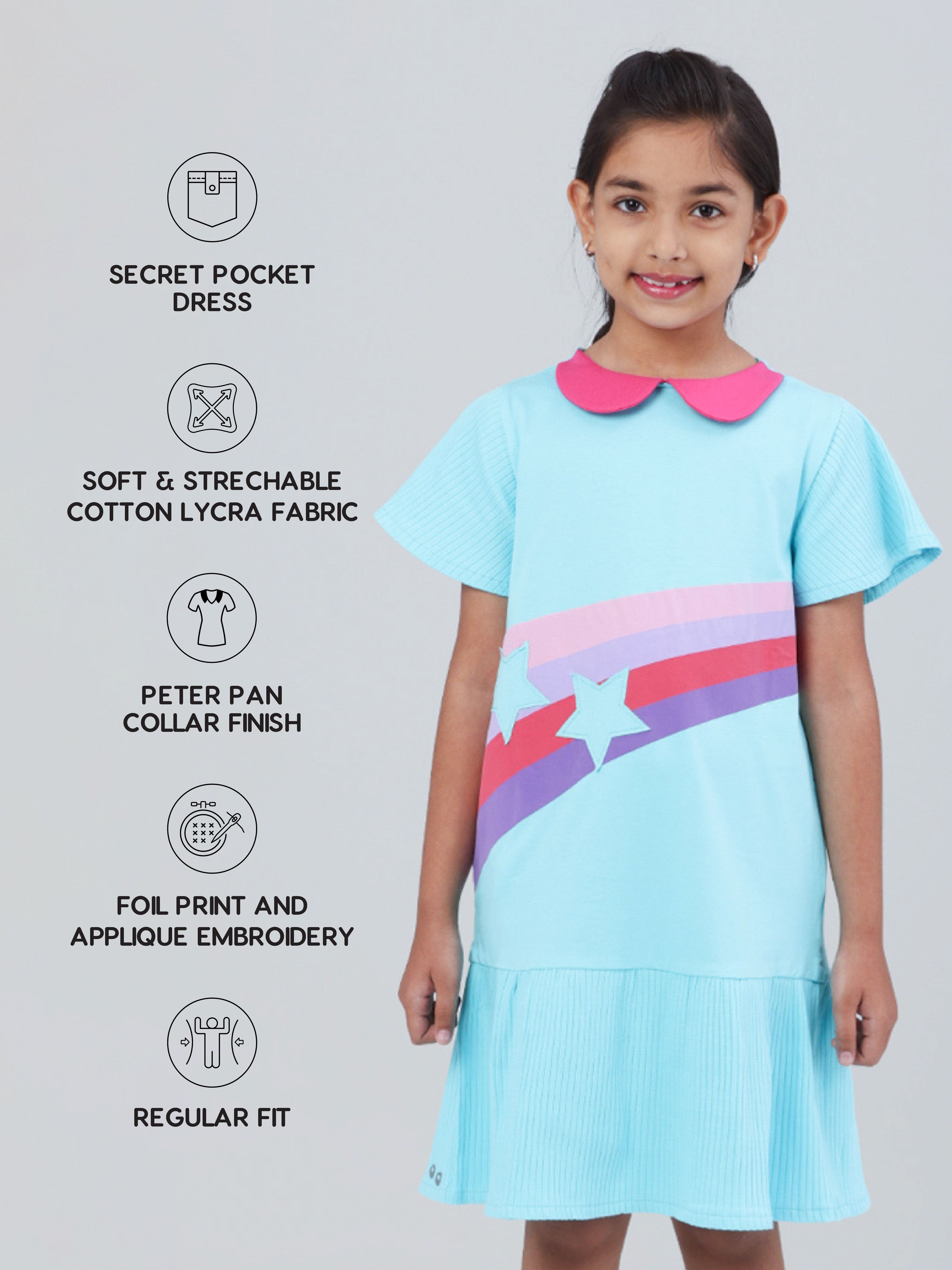 The Pilolo Rainbow Dreams Dress is a magical and whimsical addition to your little girl's wardrobe. This soft cotton blue dress is designed for all the little ones who dream of touching the stars and chasing rainbows. It features star motifs and a playful hem, making it a perfect choice for girls aged 4-9 who love to dream big and explore the world of imagination. As with all Pilolo garments, this dress includes our signature pocket, perfect for carrying tiny treasures and keeping them safe. Hidden inside is a surprise gift, making the Rainbow Dreams Dress even more special and exciting for your child. Crafted from a premium fabric blend of 95% cotton and 5% elastane, this dress is soft, breathable, and incredibly comfortable. The fabric is gentle on the skin, ensuring your child can move freely and comfortably throughout the day. Whether you're looking for a dreamy outfit for a day out, something special for a party, or a unique gift, the Pilolo Rainbow Dreams Dress fits the bill. It also makes a perfect gift for birthdays, holidays, or any special occasion. Note: For the right fit, please refer to the size chart as sizes may vary from brand to brand.