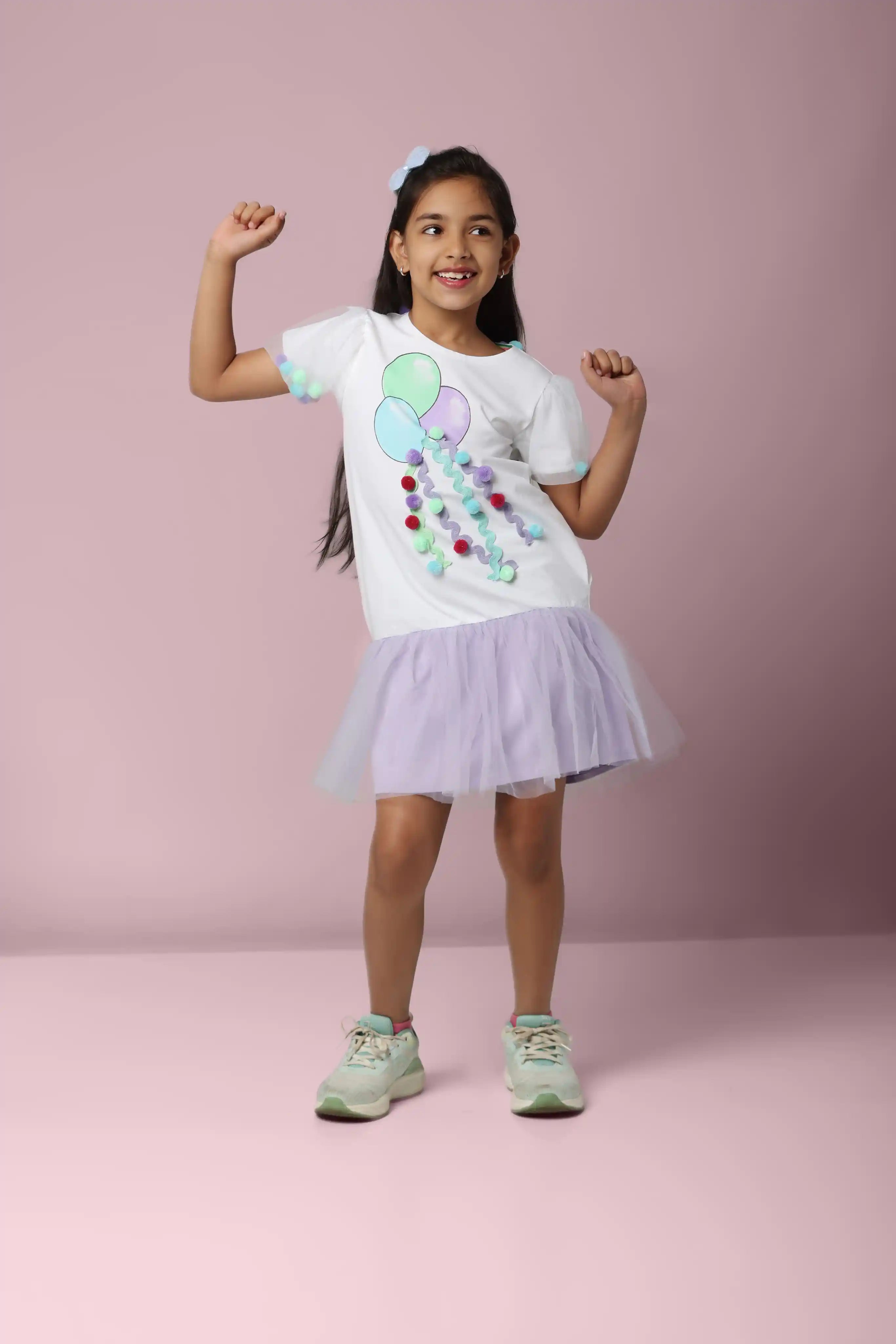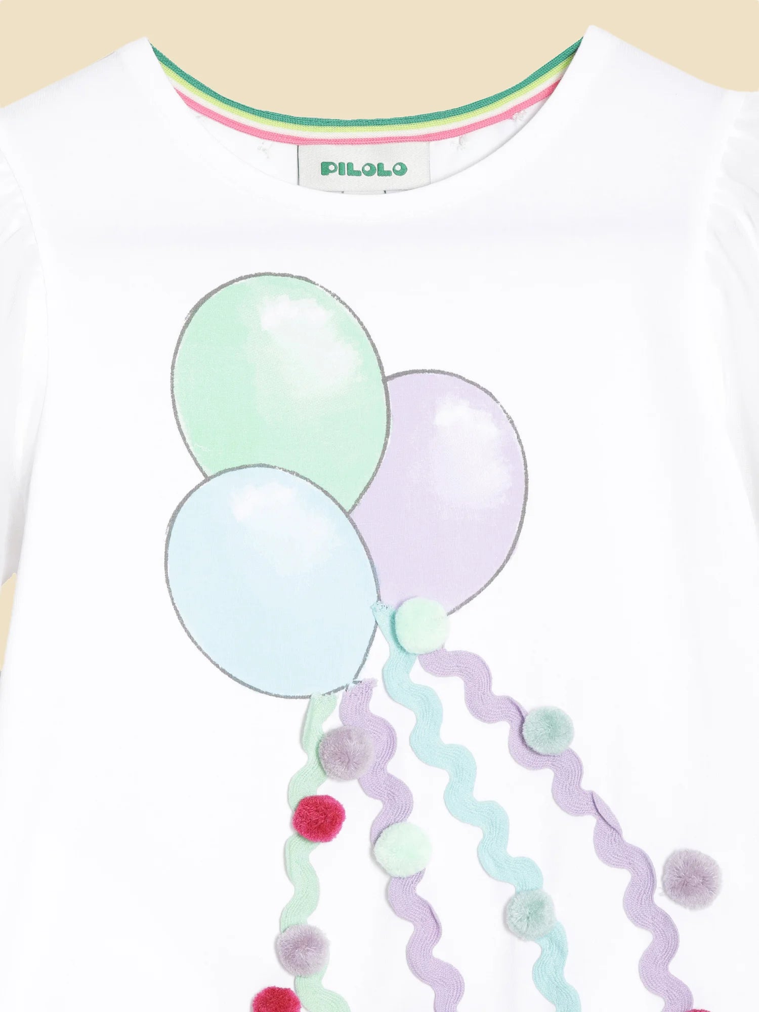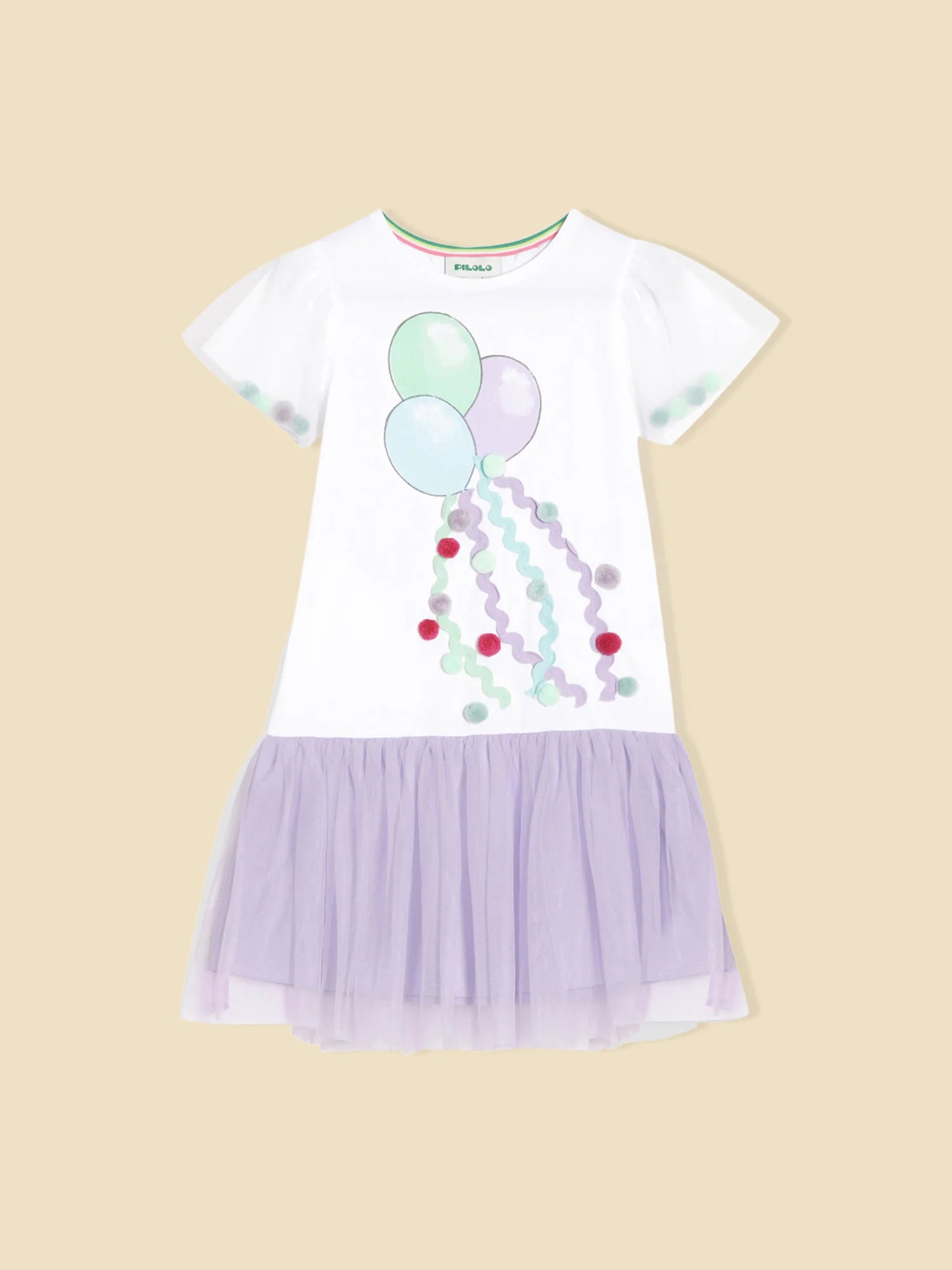 The Pilolo Twirl Balloon Dress is a charming and playful addition to your little girl's wardrobe. This dress features a hand-printed balloon design with gold foil accents that add a touch of flair. The sleeves are adorned with tulle and pompoms, making the dress perfect for girls aged 4-9 who love to twirl and have fun. Available in both white and purple, this dress is designed to stand out at any event. As with all Pilolo garments, this dress includes our signature pocket, perfect for carrying tiny treasures and keeping them safe. Hidden inside is a surprise gift, making the Twirl Balloon Dress even more special and exciting for your child. Crafted from a premium fabric blend of 95% cotton and 5% elastane, this dress is soft, stretchy, and incredibly comfortable. The fabric is gentle on the skin, ensuring your child can move freely and comfortably throughout the day. Whether you're looking for a fun outfit for a day out, something special for a party, or a unique gift, the Pilolo Twirl Balloon Dress fits the bill. It also makes a perfect gift for birthdays, holidays, or any special occasion. Note: For the right fit, please refer to the size chart as sizes may vary from brand to brand.