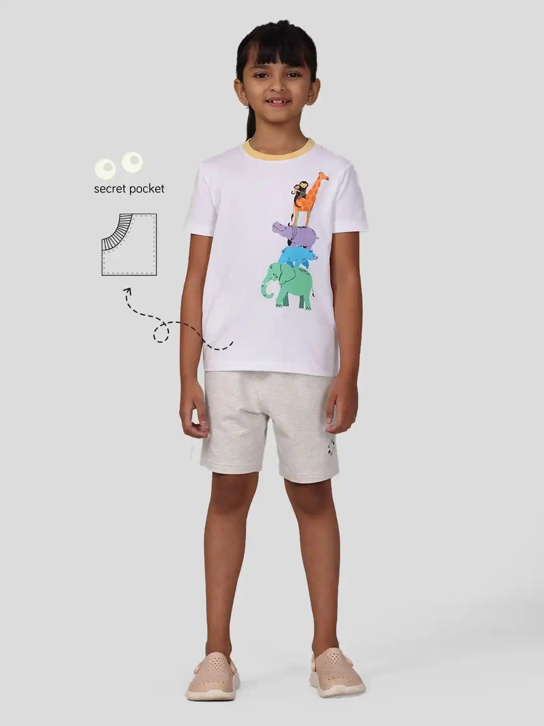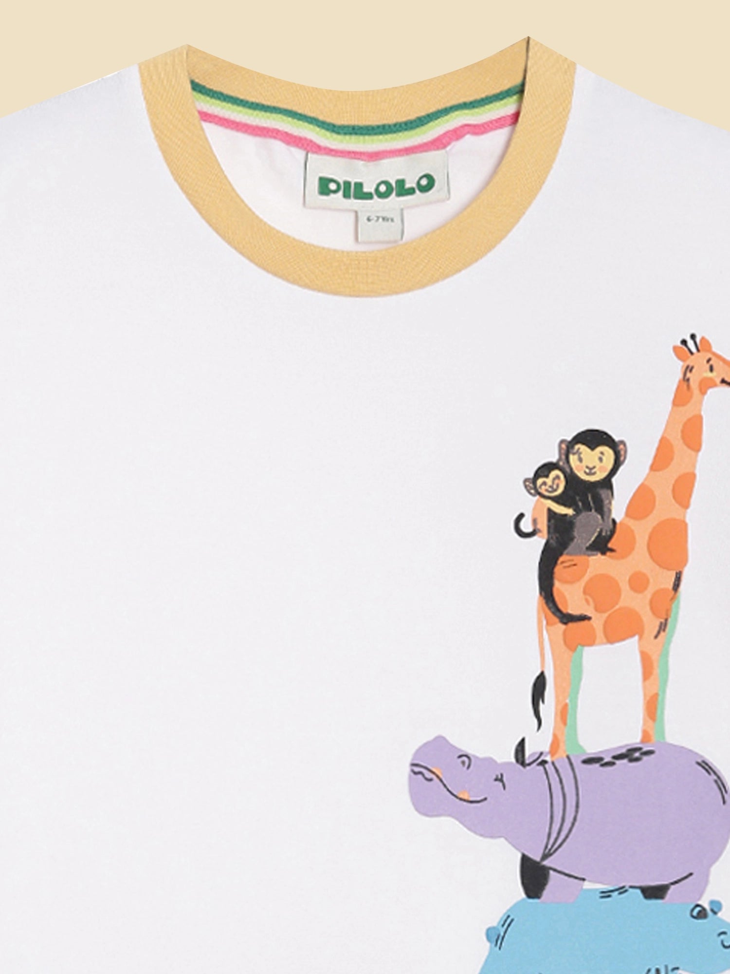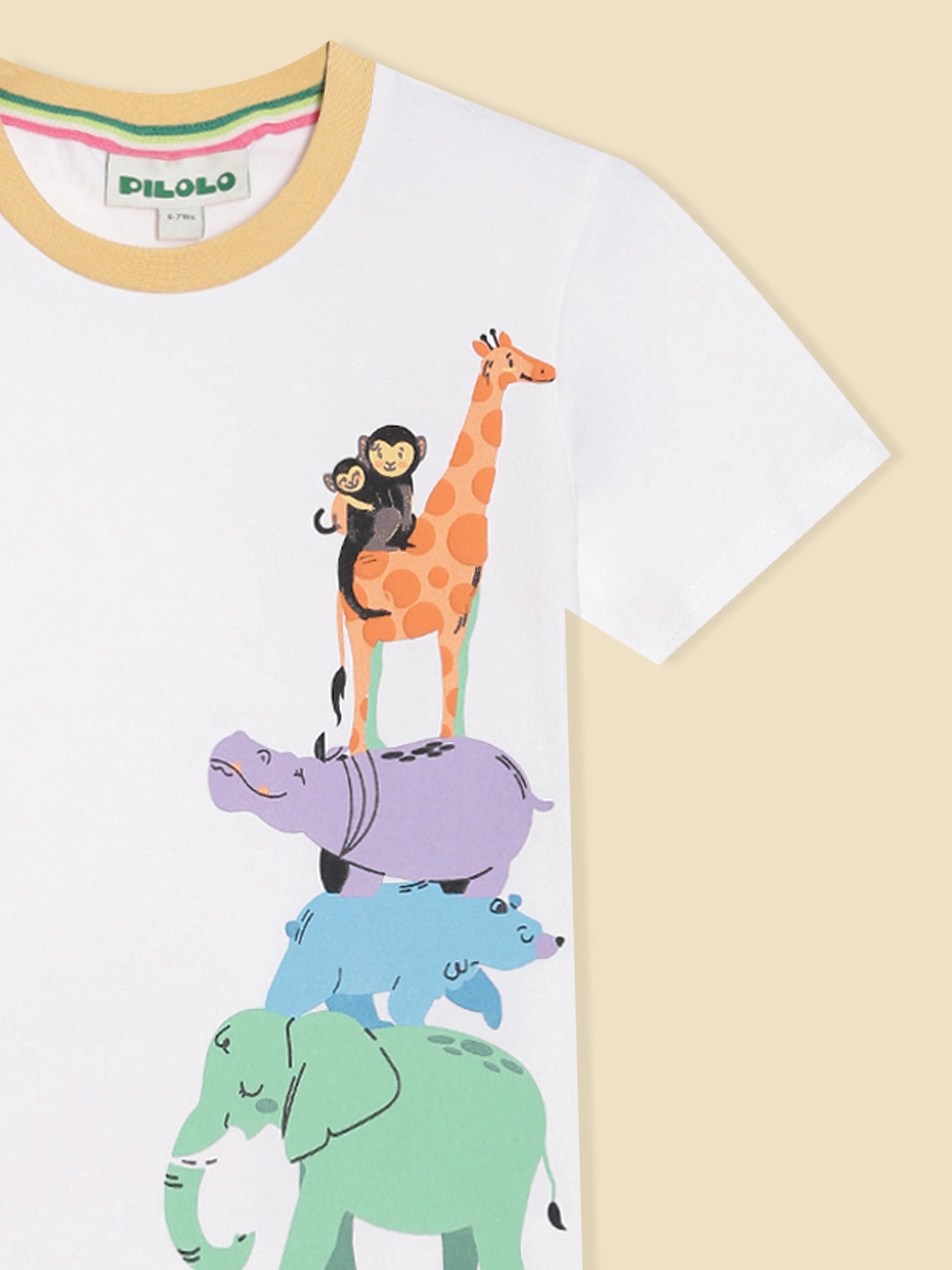 The Animal Buddies Tee is crafted using soft, breathable fabric for all-day comfort. It features a colorful animal ladder with a contrasting collar band. Every piece has a pocket that is adorable and practical - as little hands deserve a place to tuck their little adventures. Made to fit kids 2 to 10.