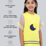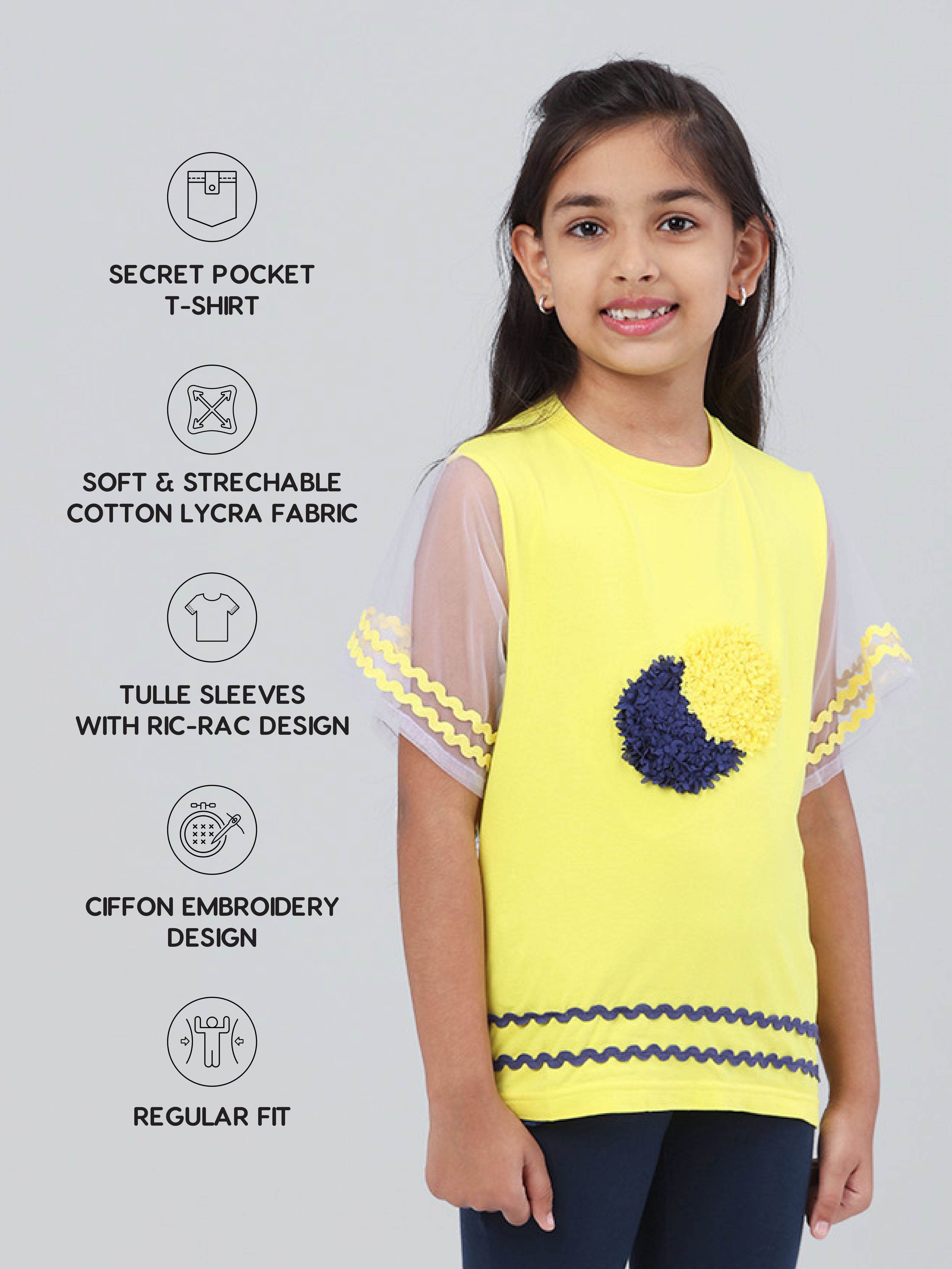 The Pilolo Flower Power Tee is a lively and playful addition to your little girl's wardrobe. This yellow t-shirt features exaggerated pompoms, ric-rac embroidered oversized polka dots, and tulle sleeves with a ric-rac border, creating a fun and vibrant look. Designed for girls aged 4-9, this tee is perfect for making a bold fashion statement. As with all Pilolo garments, this t-shirt includes our signature pocket, perfect for carrying tiny treasures and keeping them safe. Hidden inside is a surprise gift, making the Flower Power Tee even more special and exciting for your child. Crafted from a premium fabric blend of 95% cotton and 5% elastane, this t-shirt is soft, stretchy, and incredibly comfortable. The fabric is gentle on the skin, ensuring your child can move freely and comfortably throughout the day. Whether you're looking for a standout outfit for a day out, something special for playtime, or a unique gift, the Pilolo Flower Power Tee fits the bill. It also makes a perfect gift for birthdays, holidays, or any special occasion. Note: For the right fit, please refer to the size chart as sizes may vary from brand to brand.