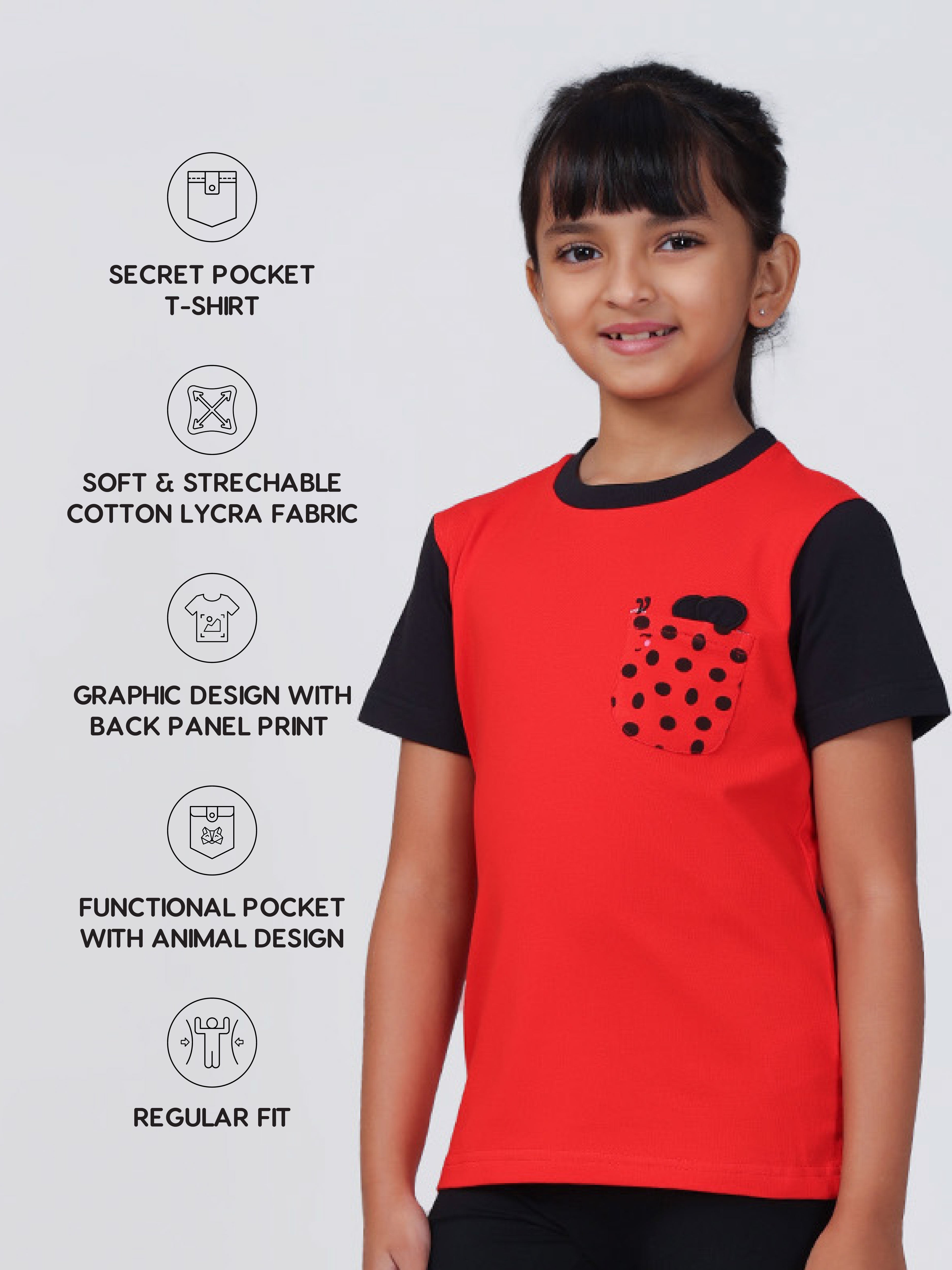 SKU: 066 - Pilolo Lively Ladybug Cute Animal Designs Back Printed Soft & Comfortable Cotton Pocket T-Shirt For Girls