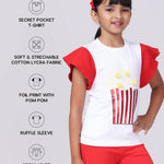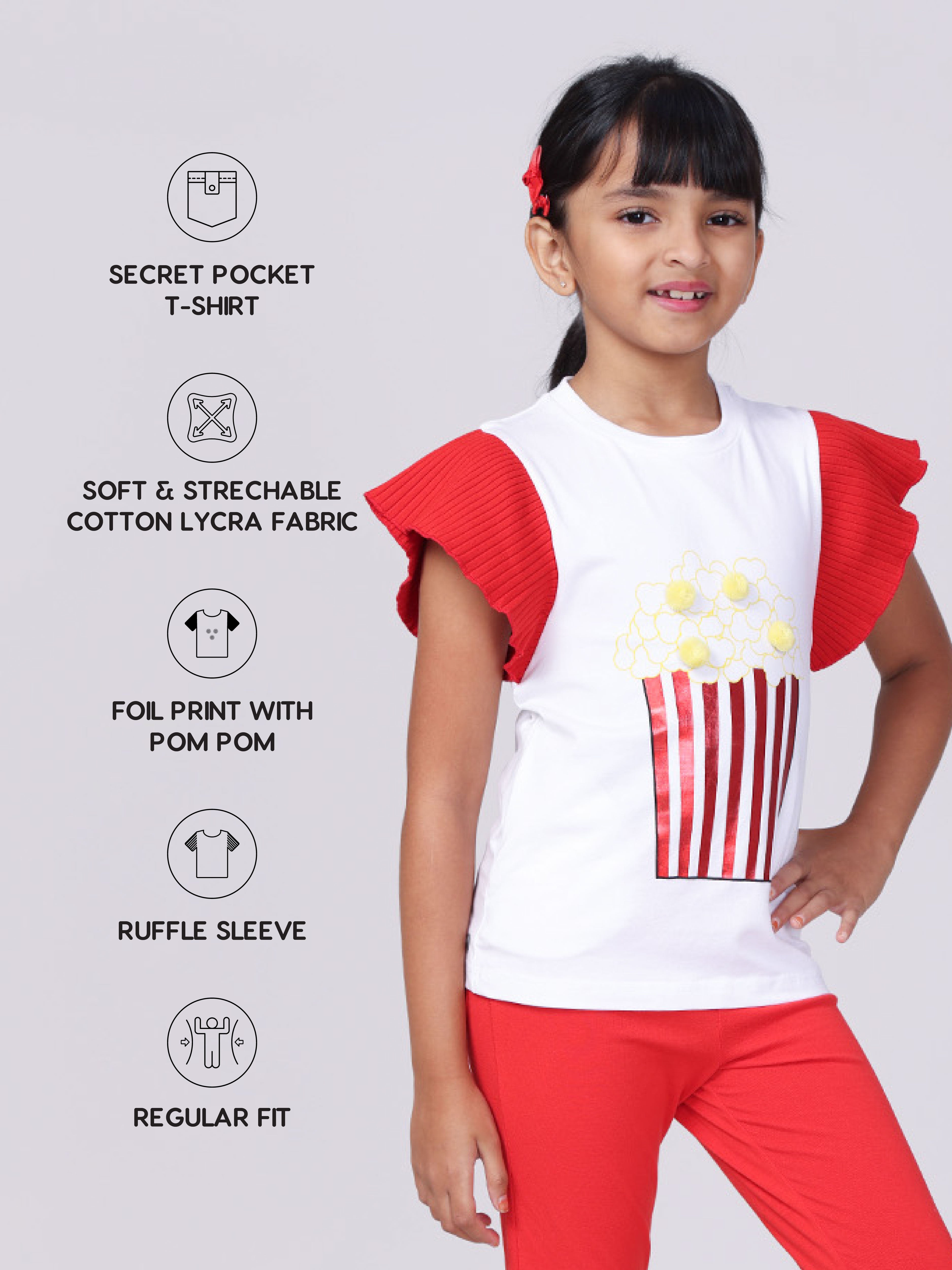 The Pilolo Popcorn Tee is a fun and playful addition to your little girl's wardrobe. Inspired by a childhood favorite snack, this white t-shirt is detailed with vibrant red ruffle sleeves, adding a touch of whimsy and style. Designed for girls aged 4-9, this tee is perfect for those who love to express their playful side. As with all Pilolo garments, this t-shirt includes our signature pocket, perfect for carrying tiny treasures and keeping them safe. Hidden inside is a surprise gift, making the Popcorn Tee even more special and exciting for your child. Crafted from a premium fabric blend of 95% cotton and 5% elastane, this t-shirt is soft, stretchy, and incredibly comfortable. The fabric is gentle on the skin, ensuring your child can move freely and comfortably throughout the day. Whether you're looking for a fun outfit for a day out, something special for playtime, or a unique gift, the Pilolo Popcorn Tee fits the bill. It also makes a perfect gift for birthdays, holidays, or any special occasion. Note:For the right fit, please refer to the size chart as sizes may vary from brand to brand.