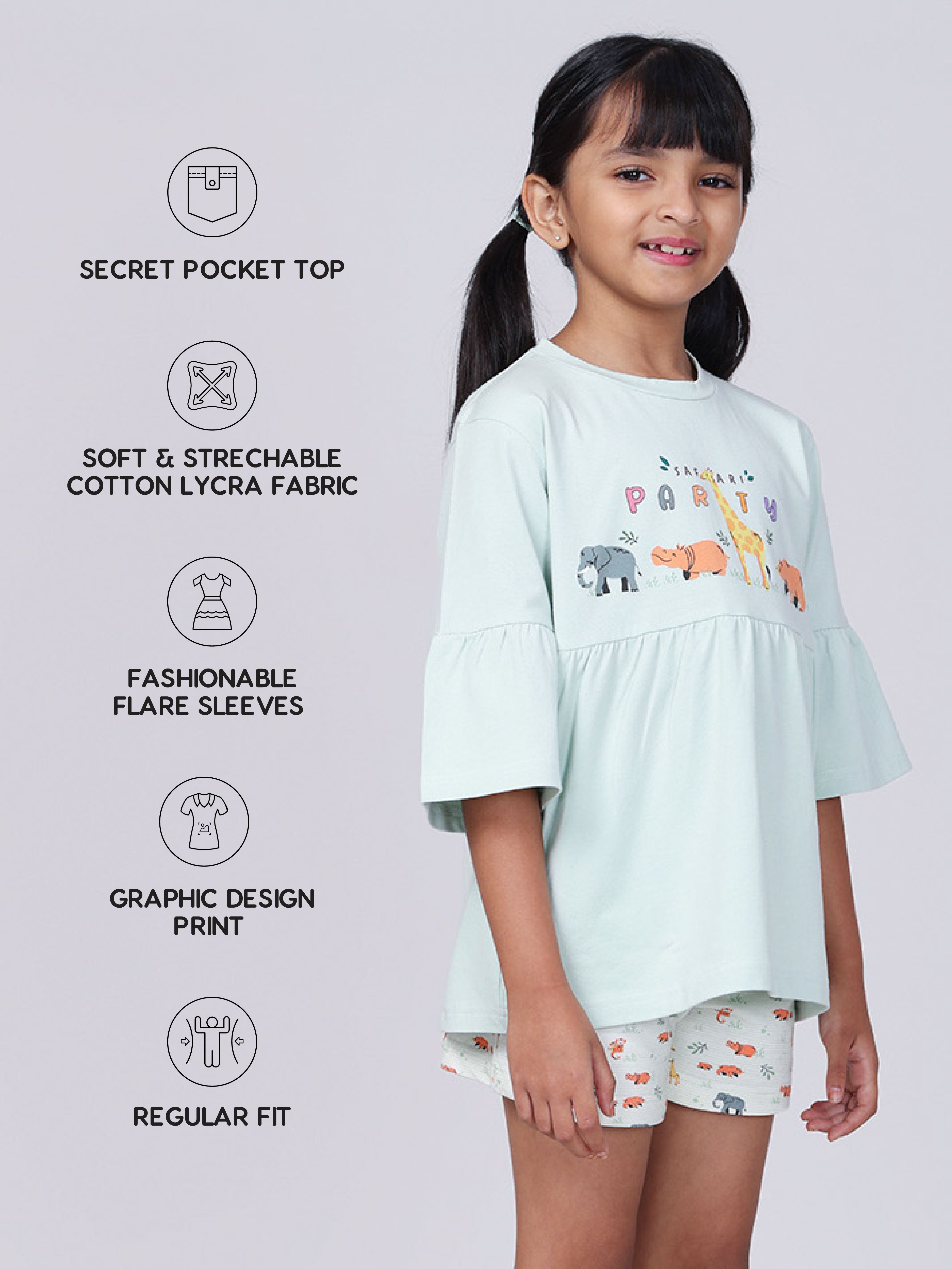 SKU: 071A - Pilolo Playful Peplum Green With Chest Print, Flare Sleeves Of Comfortable Cotton Pocket Top For Girls