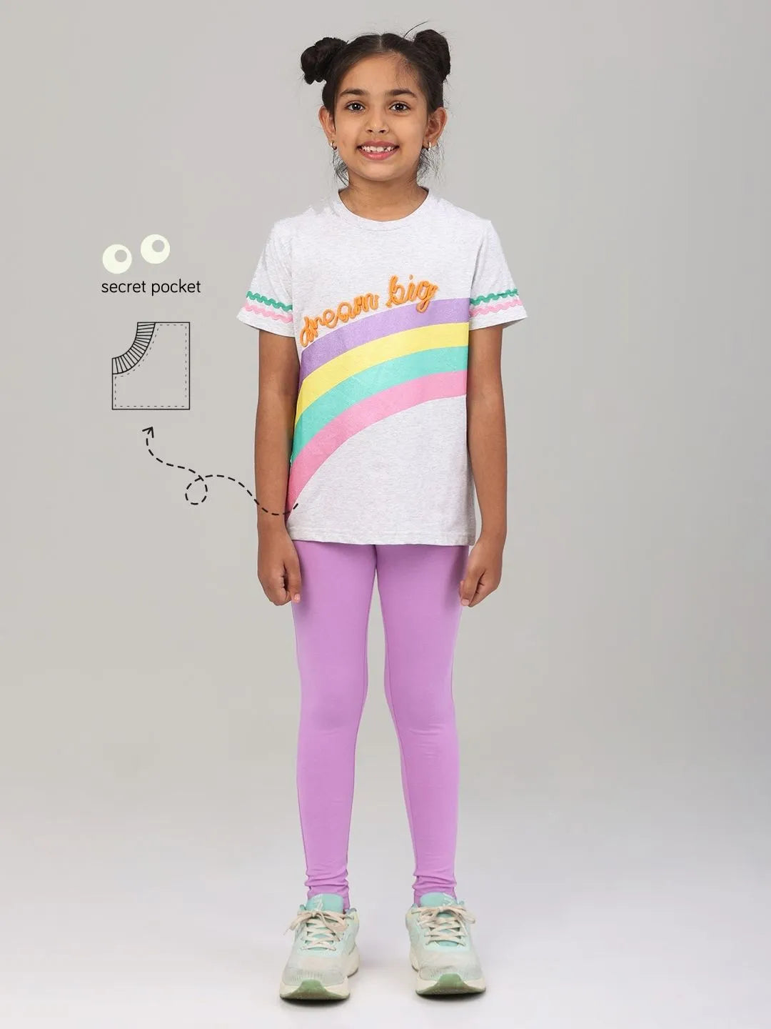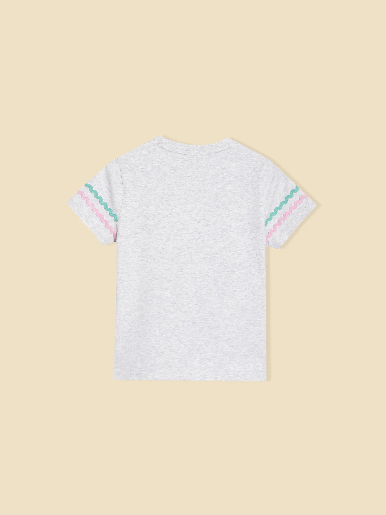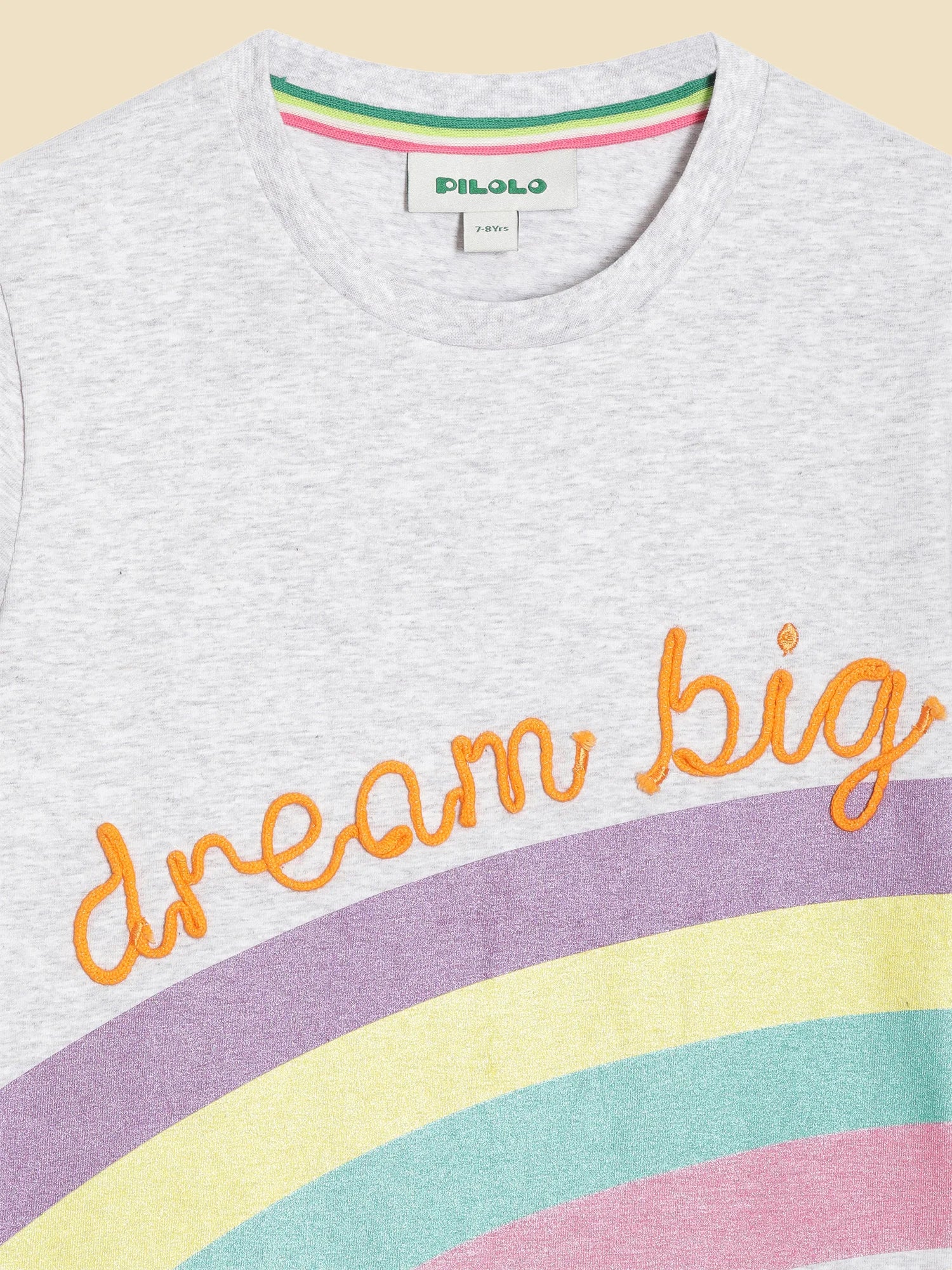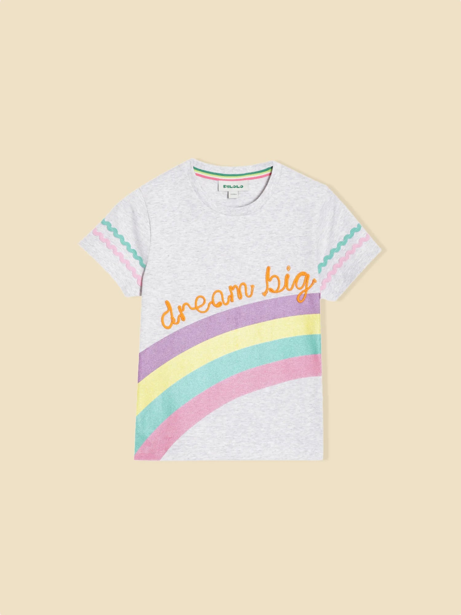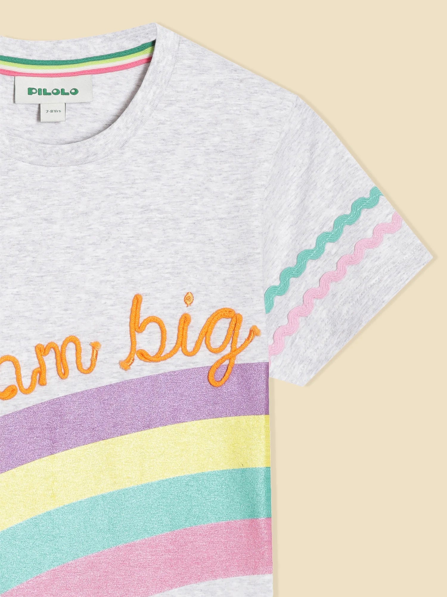 The Pilolo Over the Rainbow Tee is a charming and whimsical addition to your little girl's wardrobe. This soft cotton grey t-shirt is designed to encapsulate the spirit of little dreamers, featuring colorful ric-rac laces and a vibrant print that brings joy and imagination to life. Perfect for girls aged 4-9, this tee adds a playful and dreamy touch to any outfit. As with all Pilolo garments, this t-shirt includes our signature pocket, perfect for carrying tiny treasures and keeping them safe. Hidden inside is a surprise gift, making the Over the Rainbow Tee even more special and exciting for your child. Crafted from a premium fabric blend of 95% cotton and 5% elastane, this t-shirt is soft, breathable, and incredibly comfortable. The fabric is gentle on the skin, ensuring your child can move freely and comfortably throughout the day. Whether you're looking for a colorful outfit that inspires creativity, something special for a day out, or a unique gift, the Pilolo Over the Rainbow Tee fits the bill. It also makes a perfect gift for birthdays, holidays, or any special occasion. Note: For the right fit, please refer to the size chart as sizes may vary from brand to brand.
