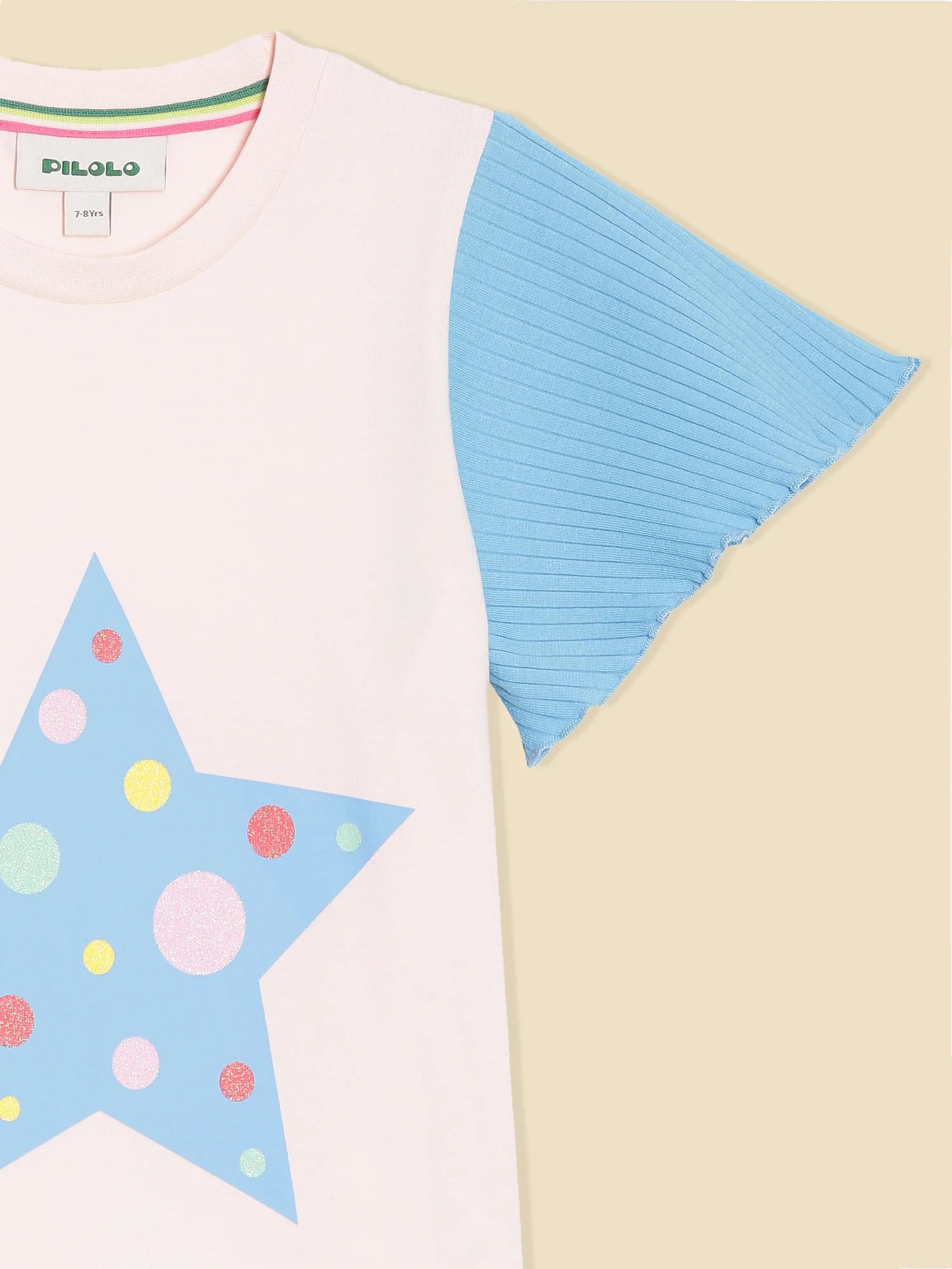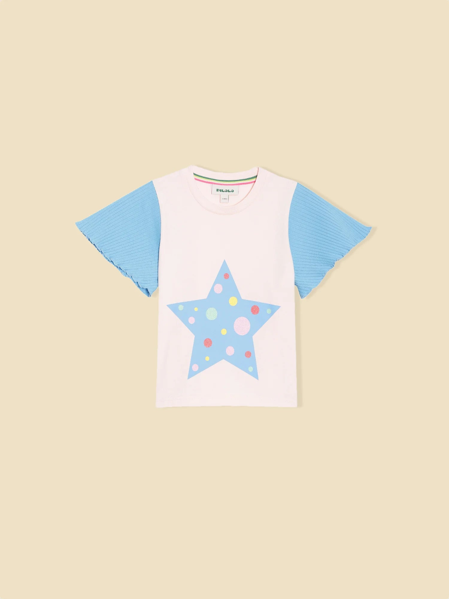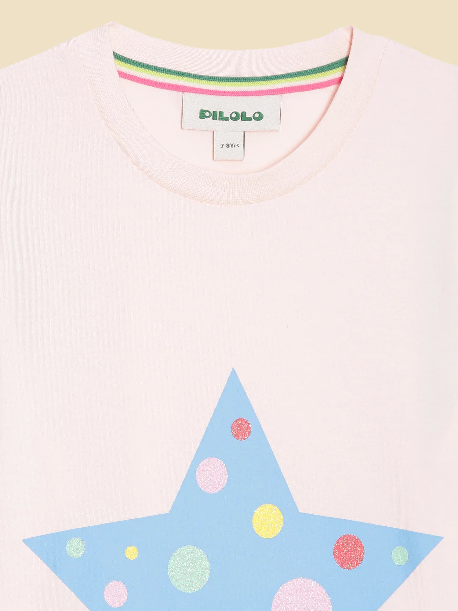 The Pilolo Such a Star Tee is a vibrant and stylish addition to your little girl's wardrobe. This pink t-shirt features a bold polka-dotted star and flowy contrast sleeves, making it a standout piece that’s perfect for girls aged 4-9. The playful design ensures your child will shine in any setting. As with all Pilolo garments, this t-shirt includes our signature pocket, perfect for carrying tiny treasures and keeping them safe. Hidden inside is a surprise gift, making the Such a Star Tee even more special and exciting for your child. Crafted from a premium fabric blend of 95% cotton and 5% elastane, this t-shirt is soft, stretchy, and incredibly comfortable. The fabric is gentle on the skin, ensuring your child can move freely and comfortably throughout the day. Whether you're looking for a standout casual outfit, something special for a day out, or a unique gift, the Pilolo Such a Star Tee fits the bill. It also makes a perfect gift for birthdays, holidays, or any special occasion. Note: For the right fit, please refer to the size chart as sizes may vary from brand to brand.