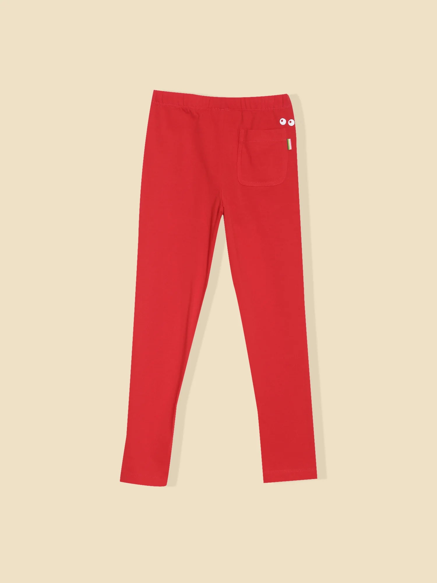 Dance and groove to your favorite tunes and balance on a log at the park in the Trendy Red Leggings. The leggings are stretchy, soft and breathable offering all-day comfort and a snug fit that moves with your child. with playful designs, beautiful embroidery and a functional back pocket, these leggings are trendy and functional for kids from 2 to 10. Fit: Regular Fabric: 95% cotton, 5% elastane, Single Jersey Care Instruction: Tumble dry in cold water with like colors; keep it fresh, do not bleach. Color: Red