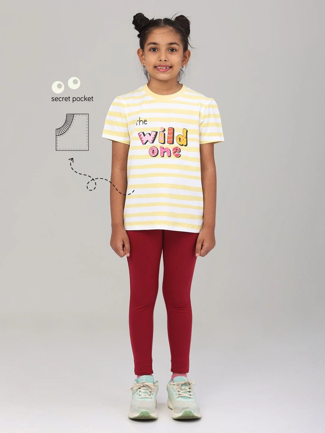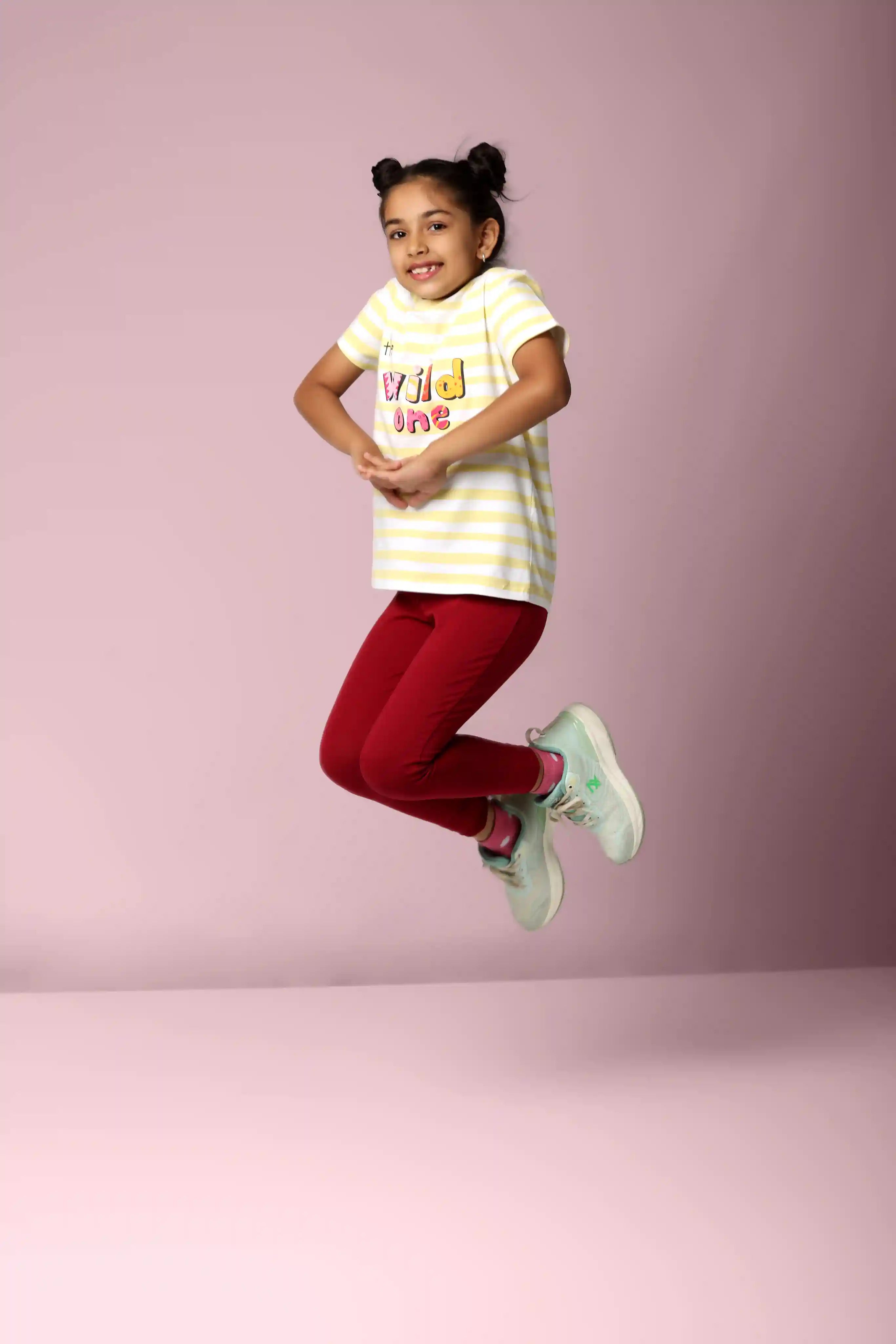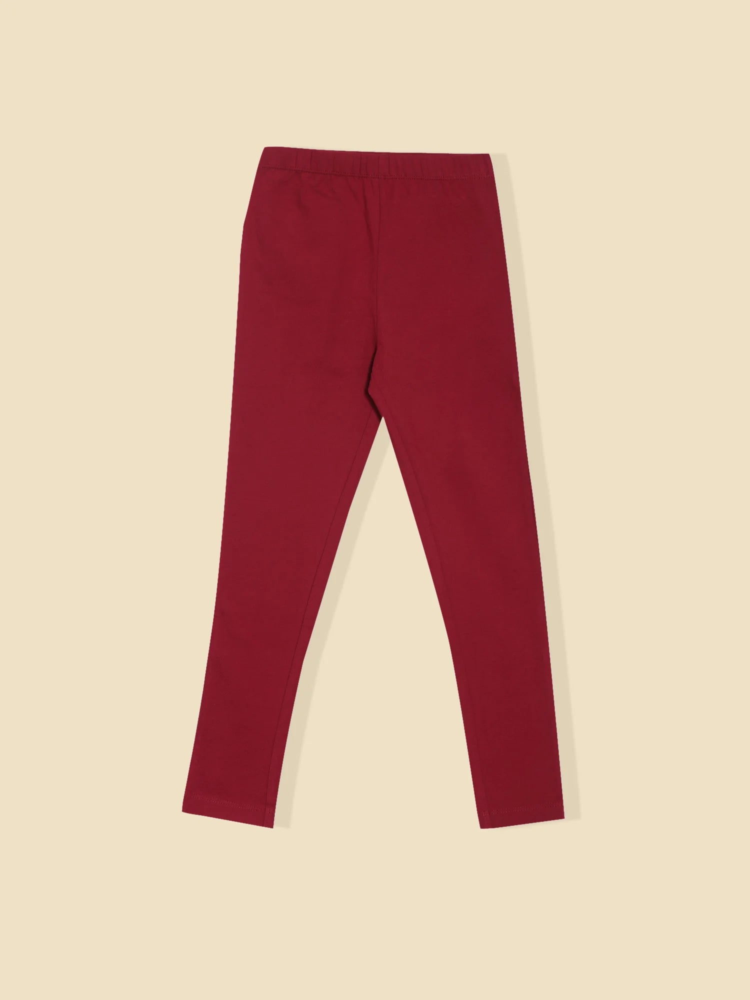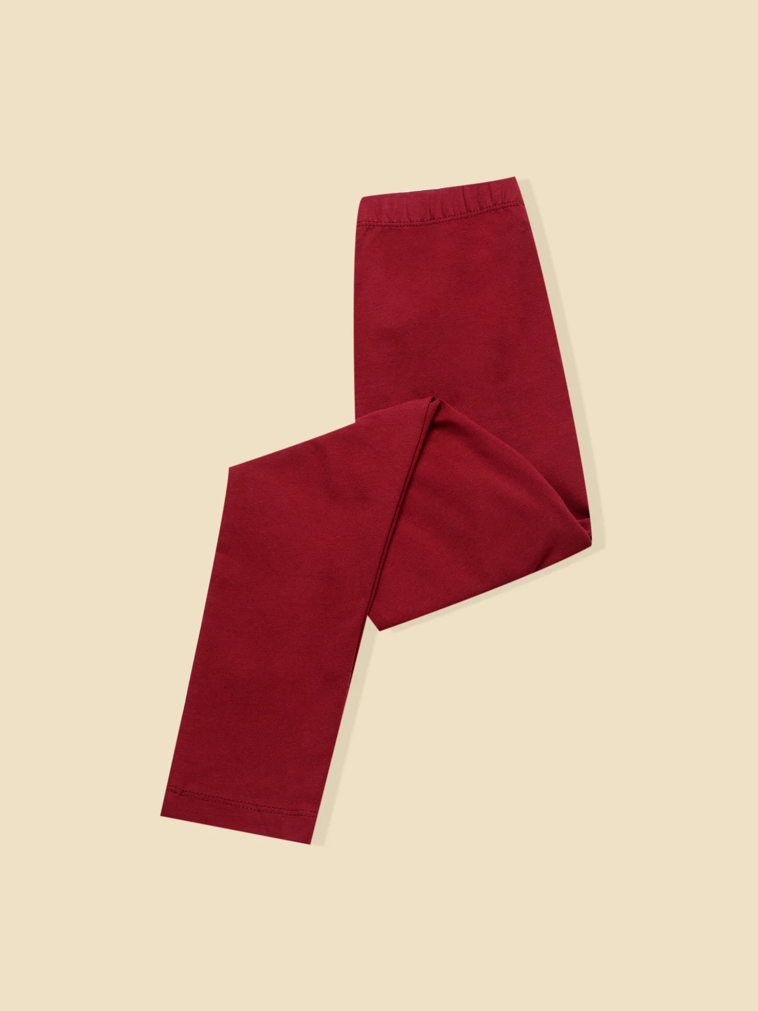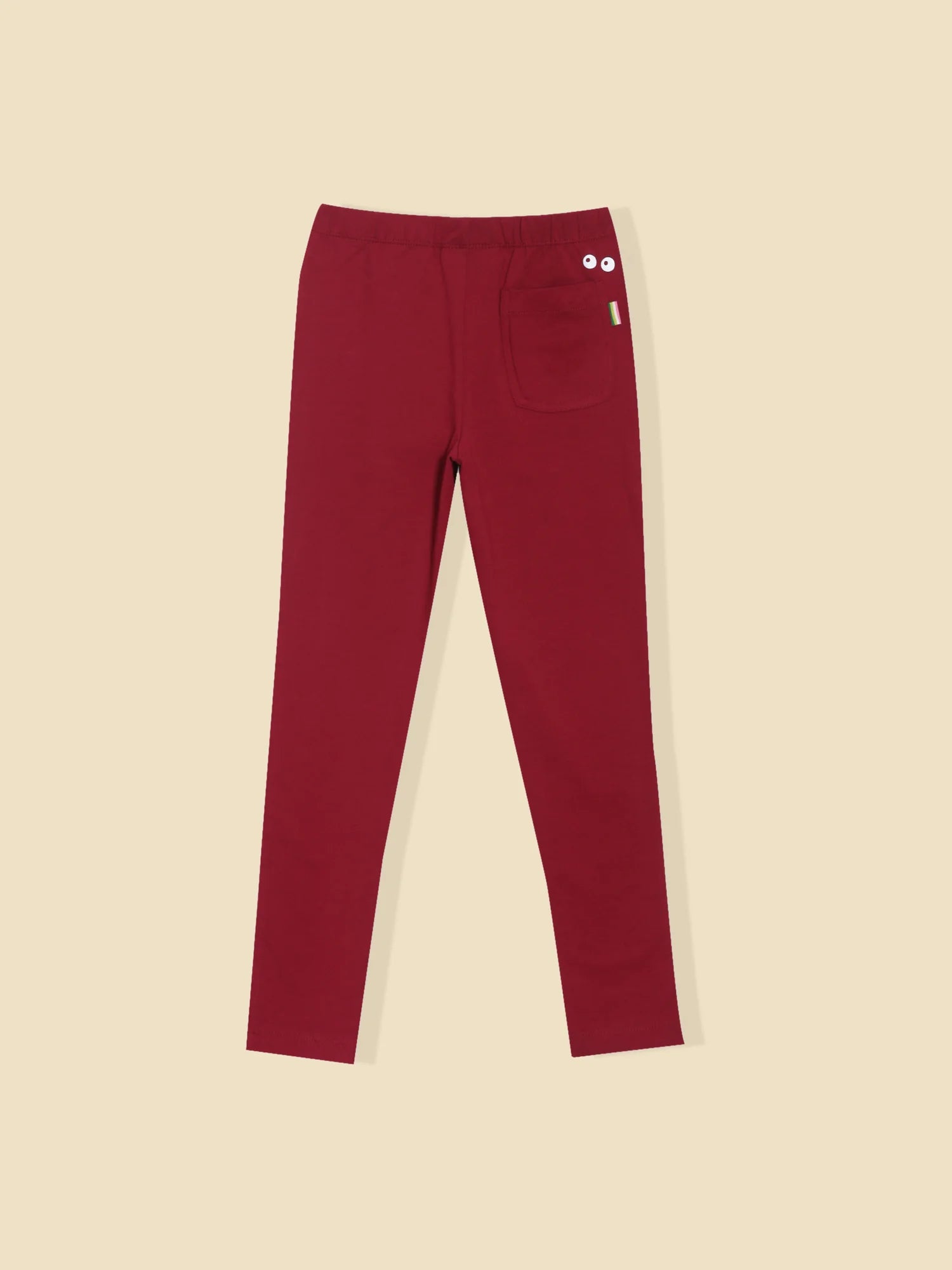 Enjoy the thrill of jumping in the air or spin around with a friend in the Trendy Rumba Leggings. The leggings are stretchy,soft and breathable offering all-day comfort and a snug fit that moves with your child. with playful designs, beautiful embroidery and a functional back pocket, these leggings are trendy and functional for kids from 2 to 10. Fit: Regular Fabric: 95% cotton, 5% elastane, Single Jersey Care Instruction: Tumble dry in cold water with like colors;keep it fresh, do not bleach. Color: Maroon