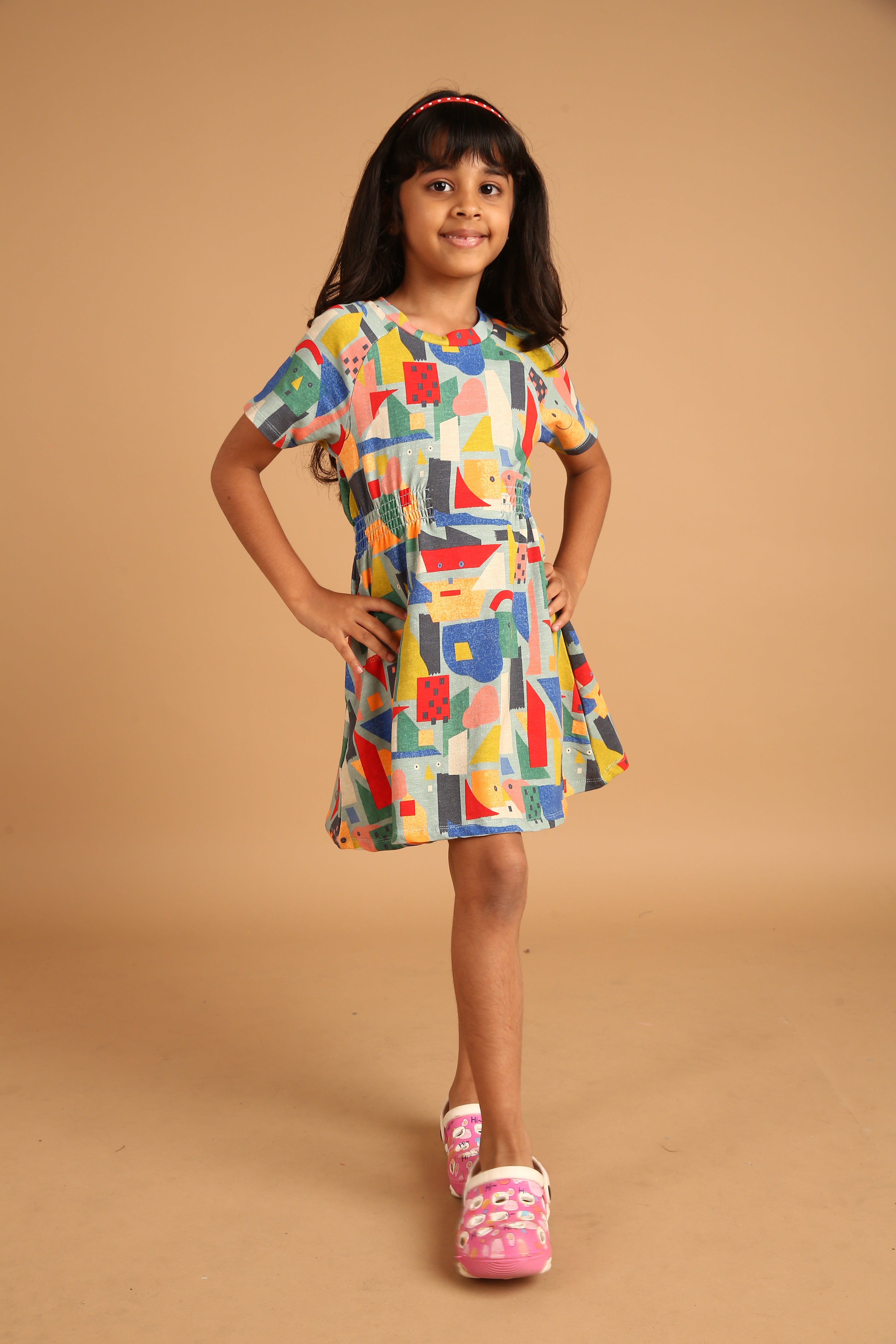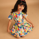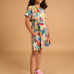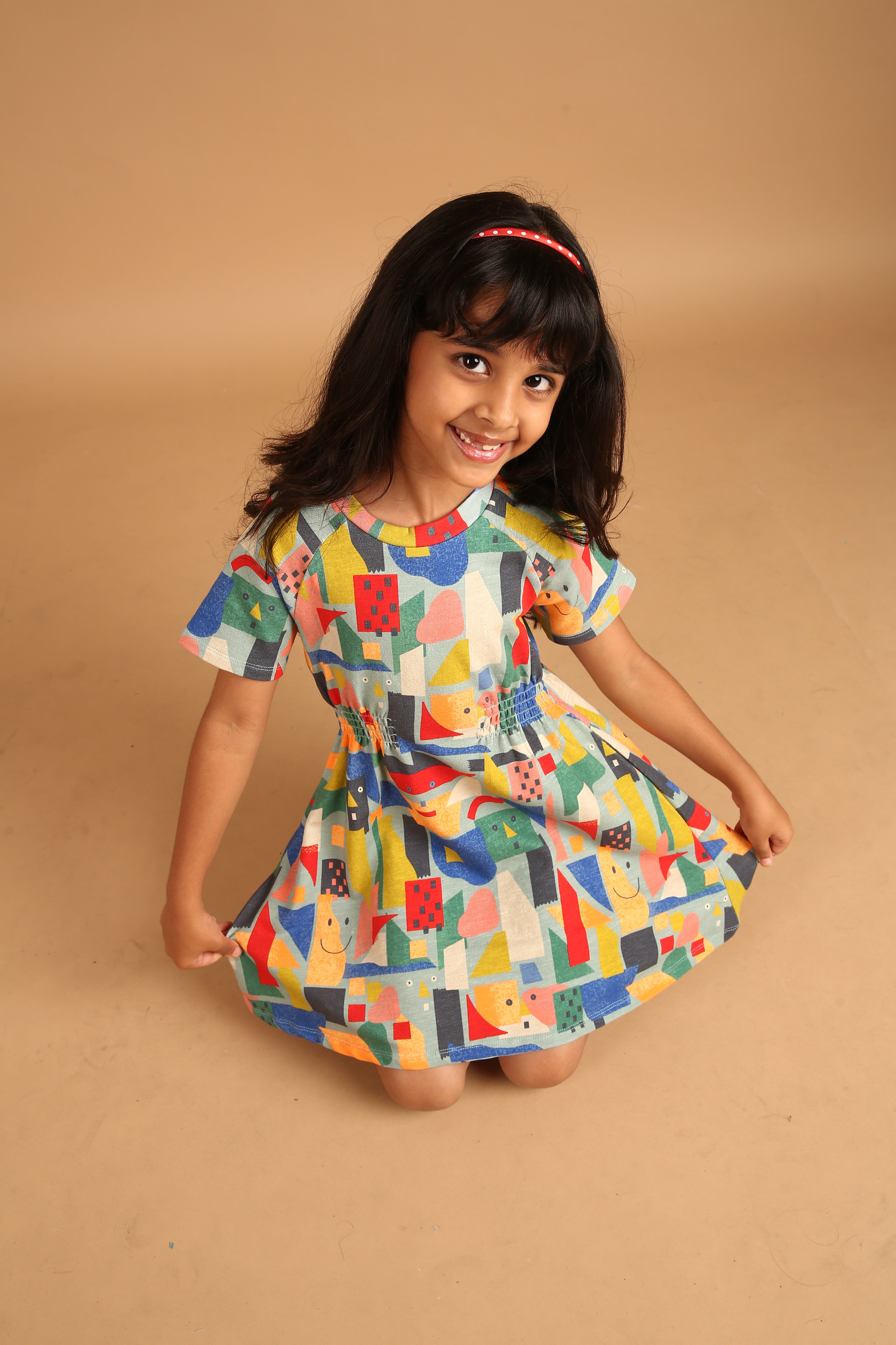 SKU: 106B - Pilolo Silly Faces Raglan Multi Color Allover print Cotton Pocket Fashion Dress For Girls