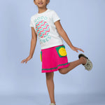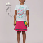 The Pilolo Good Vibes Tee is a cheerful and vibrant addition to your little girl's wardrobe. This green t-shirt is adorned with colorful ric-rac lace, adding a playful and lively touch that’s perfect for girls aged 4-9. The design is simple yet eye-catching, making it a versatile piece for any occasion. As with all Pilolo garments, this t-shirt includes our signature pocket, perfect for carrying tiny treasures and keeping them safe. Hidden inside is a surprise gift, making the Good Vibes Tee even more special and exciting for your child. Crafted from a premium fabric blend of 95% cotton and 5% elastane, this t-shirt is soft, stretchy, and incredibly comfortable. The fabric is gentle on the skin, ensuring your child can move freely and comfortably throughout the day. Whether you're looking for a fun outfit for a day out, something special for playtime, or a unique gift, the Pilolo Good Vibes Tee fits the bill. It also makes a perfect gift for birthdays, holidays, or any special occasion. Note: For the right fit, please refer to the size chart as sizes may vary from brand to brand.