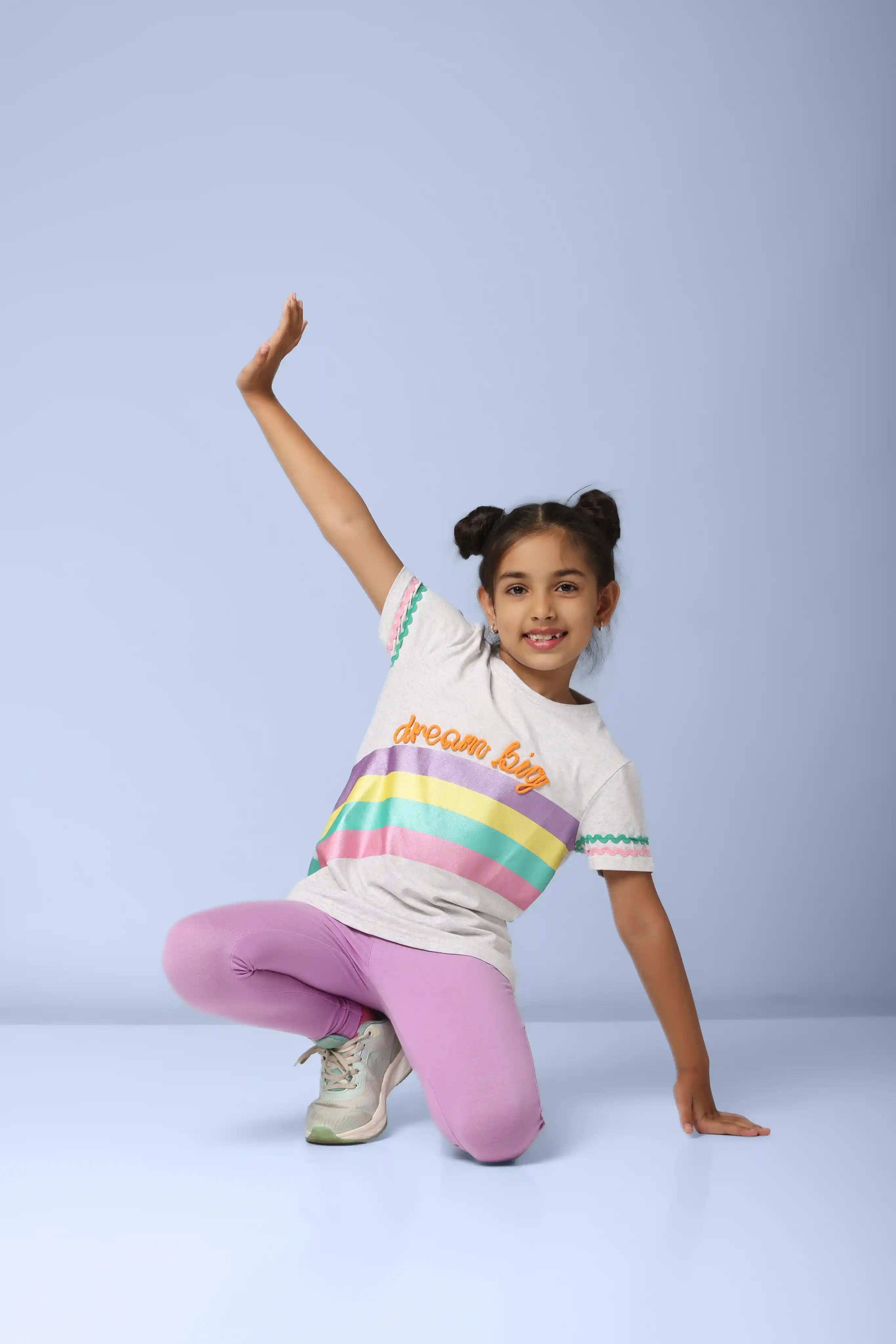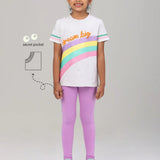 Jump over obstacles and toss soft balls in the Trendy Violet Leggings. The leggings are stretchy, soft and breathable offering all-day comfort and a snug fit that moves with your child. with playful designs, beautiful embroidery and a functional back pocket, these leggings are trendy and functional for kids from 2 to 10. Fit: Regular Fabric: 95% cotton, 5% elastane, Single Jersey Care Instruction: Tumble dry in cold water with like colors; keep it fresh, do not bleach. Color: Violet